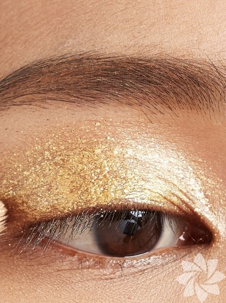 Bu sezon iddialı gözler ön plandaydı ve altın dokunuşlar, göz kapağına özenle yerleştirilmiş zarif altın tonlar, çıplak kirpikleri, doğal ten rengini ve soluk pembe dudakları mükemmel bir şekilde dengeliyor.