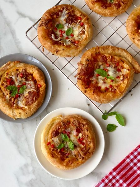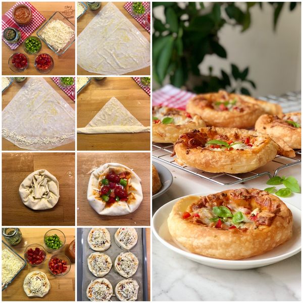 *Yufkaların her birini dört eşit parçaya ayırın. Üzerlerine fırça yardımıyla sütlü sostan sürün, geniş kenarlarına birer yemek kaşığı peynir yayın ve gevşekçe sararken uca doğru dört parmak bırakıp kendi etrafında döndürerek sarın (görseldeki gibi), ucuna sos sürerek sabitleştirin. Üzerlerine sırayla domates sosu, peynir, doğranmış biber & domatesler, tekrar peynir ve en üste kekik serpiştirin (peynirin 50 gram kadarını kenara ayırın). Sardığınız yufkaların kenarlarına kalan sosu sürün.
