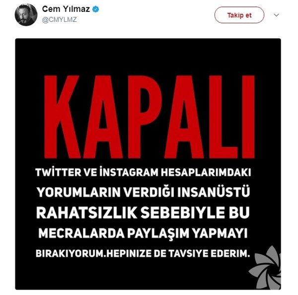 Sosyal medyayı aktif bir şekilde kullanan Cem Yılmaz, daha önce birçok ünlünün de rahatsızlığını dile getirdiği "kötü yorum" nedeniyle sosyal medya hesaplarını kapattığını duyurmuştu.