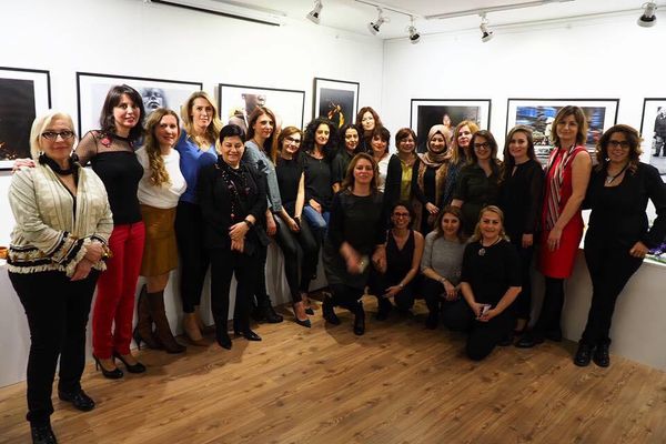 Kadın fotoğaflarını bir sergide buluşturan kadınlar, serginin açılışında toplu poz verdi.