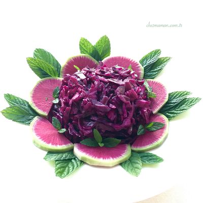- Lahana karışımını servis tabağına aldıktan sonra turp ve nane yapraklarıyla süsleyin.