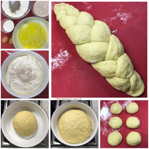 Saç örgüsü yapmak için bezelerden her birini üç eşit parçaya ayırarak yaklaşık 40 cm uzunluğunda rulolar yapın, saç örgüsü şekline getirin, uçlarını altına doğru kıvırarak sabitleyin ve tepsiye yerleştirin. Diğer bezeye de aynı işlemi uygulayın (tekrar mayalanıp kabarmalarını dikkate alarak hamurları tepsiye aralıklı olarak yerleştirmeli).