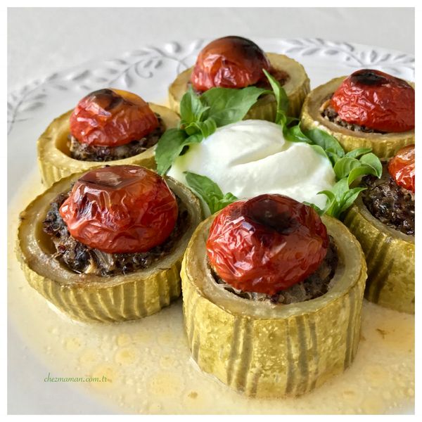 Kabakların her iki tarafını oyarak bulgur veya pirinç yerine kinoa ve kıymalı harç ile doldurarak hazırladığım sağlıklı ve lezzetli bir fırın yemeği…