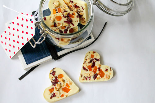 Beyaz çikolata benmari usulü ya da dikkatli olarak mikrodalga fırında eritilir. Yağlı fırın kağıdının ya da istenen formadaki çikolata kalıplarının içine eşit miktarlarda 1/2 cm yüksekliğinde dökülür, üzerine istenen miktarda istenen malzeme konur, buz dolabında soğumaya bırakılır. Tamamen katılaştıktan sonra kalıplardan çıkarılıp yemeğe hazırdır.