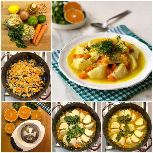 *Havuçlar ve kuru soğanı yemeklik doğrayıp geniş bir tencereye aktarın, bir yemek kaşığı zeytinyağı ekleyip orta ateşte 4 - 5 dakika kavurun. Baharatları ve tuzu ekleyip karıştırın, doğranmış kerevizleri unlu sudan çıkartıp kavrulmuş havuç ve kuru soğanın üzerine tek sıra halinde yerleştirin. Üzerlerine mandalina suyu, yarım limon suyu, doğranmış kereviz sapı ve yaprakları, en son yarım çay bardağı sıcak suyu ilave edin. Pişirme kağıdını tencerenin boyutunda kesip ortasından delik açarak sebzelerin üzerine yerleştirin, tencerenin kapağı kapalı olarak kısık ateşte yaklaşık 25 dakika pişirin.